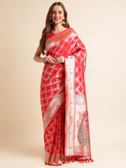 Beautiful pink Chinon saree with red Patola print and contrast blouse – soft, stylish and Perfect